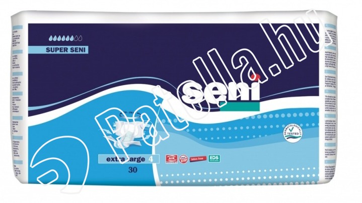 Seni Super Extra Large egyszerhasználatos légáteresztő nadrágpelenka középsúlyos és súlyos inkontinencia kezelésére. A dupla nedvszívó mag gyors folyadék elvezetést tesz lehetővé a belső magba, mely szuperabszorbenst ( folyadékmegkötő anyagot) és szagmegkötő anyagot tartalmaz. A kettős nedvszívó mag megakadályozza a terméken belüli összecsomósodást és gyors folyadék- és szagmegkötést eredményez. A nedvesség indikátor információt nyújt a termék cseréjének szükségességéről. A dupla tépőzáras ragasztószalag lehetőséget ad többszöri szétnyitáshoz a külső réteg megsérülésének veszélye nélkül, A termék anatómiailag formált, ezért könnyű felhelyezhetőséget biztosít.